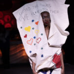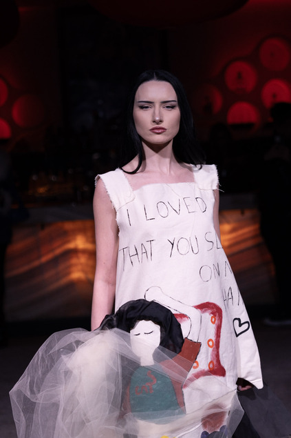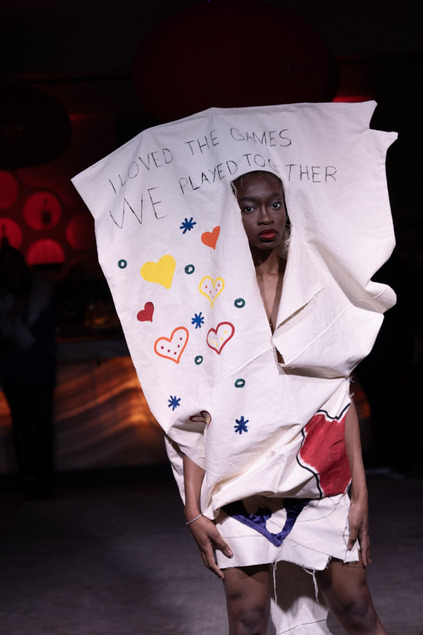Constructed primarily from heavy canvas, the garments become both surface and memory. Through layers of appliqué, handwritten text, and acrylic markings, each piece carries fragments of a shared past, moments not documented but deeply felt.